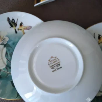 This delicate bone china tea set is lovely, featuring beautiful colors that complement my decor. From the teapot to the spoons, everything is quite pretty. Would definitely purchase again.