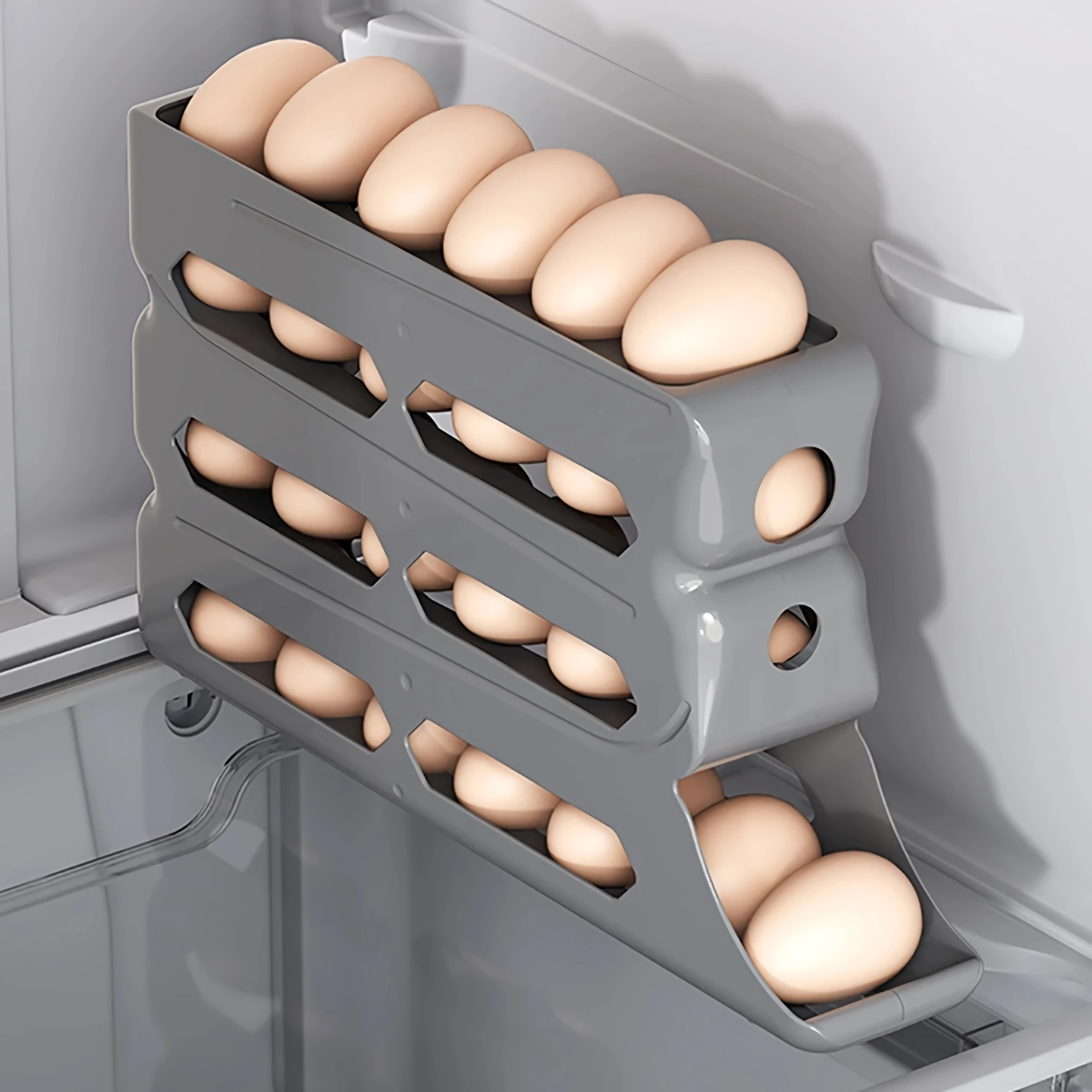 Keep your refrigerator organized and your eggs fresh with this Four-Layer Automatic Rolling Egg Storage Rack. Designed to save space and prevent egg breakage, this innovative rack features a clever roll-down system that brings eggs forward automatically, making it easy to grab the next egg without disturbing the others. With its compact design, this storage rack easily fits into the side door of your refrigerator, providing a neat and accessible solution for egg storage. Made from durable, food-safe HIPS plastic, this kitchen organizer is a must-have for anyone who values efficiency and style in their kitchen.