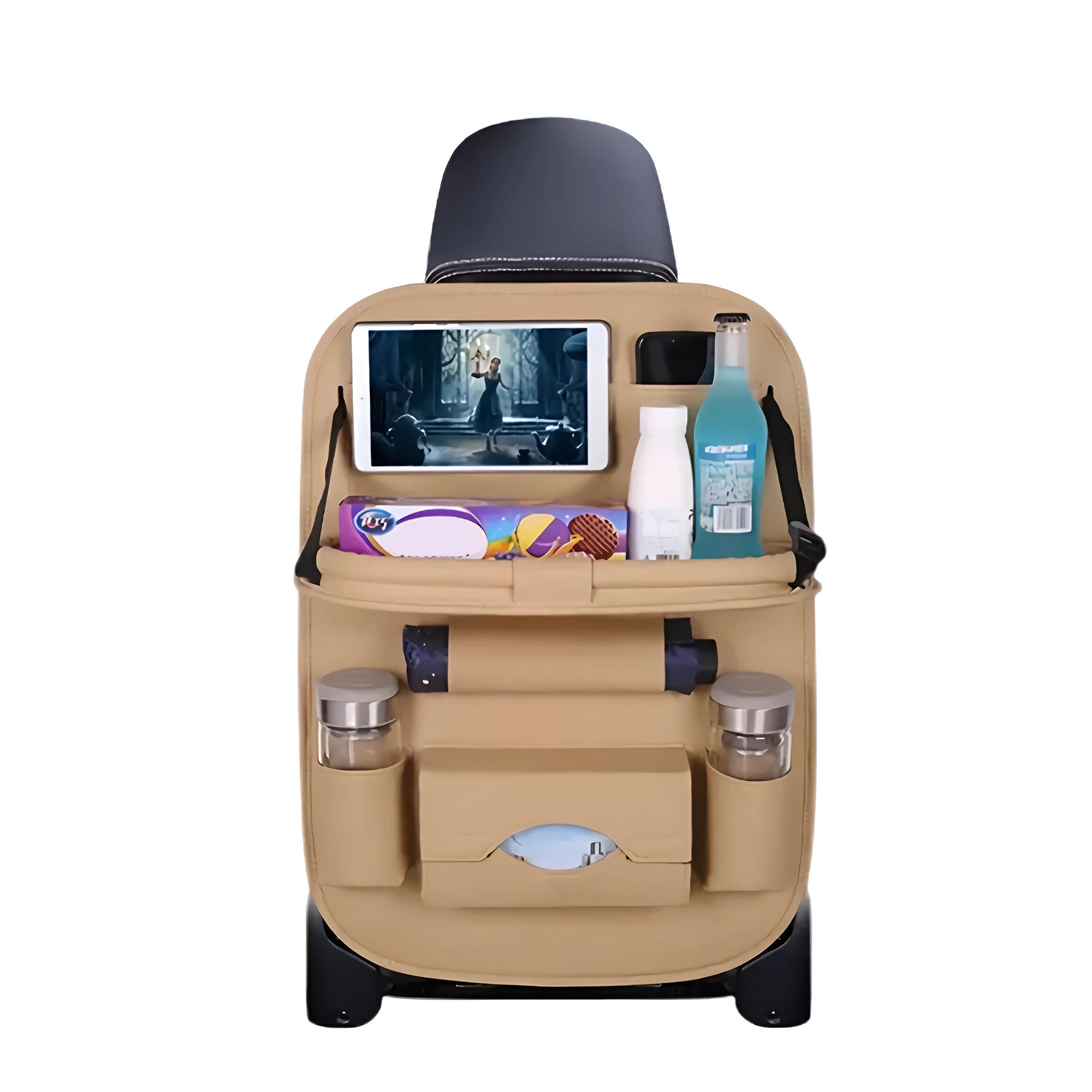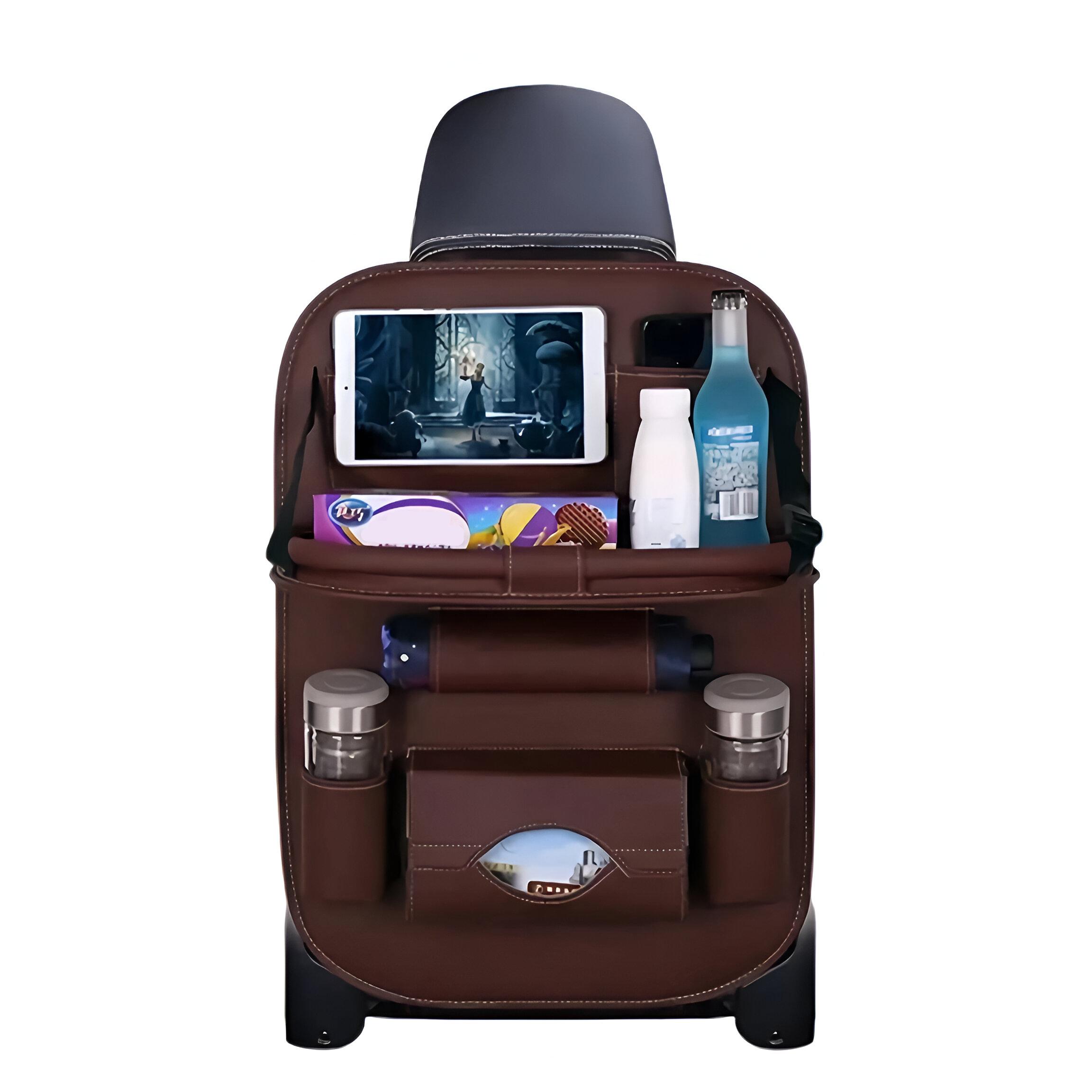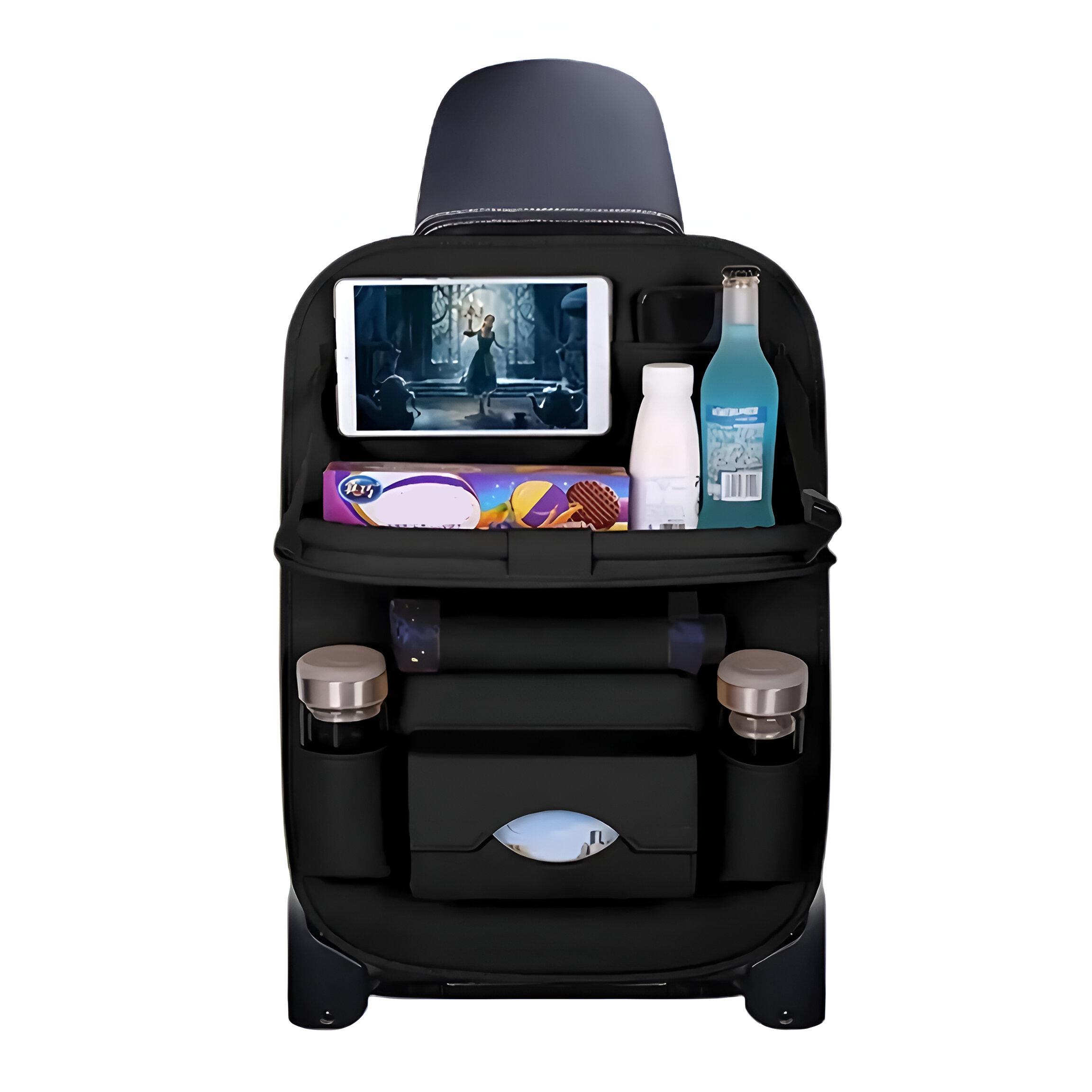 Premium Car Seat Back Organizer with Foldable Table Tray – PU Leather Storage and Kick Mat