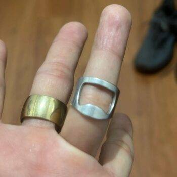 A true innovation in the world of beverage accessories. It fits perfectly and works flawlessly every time. The material is premium, giving it a luxurious feel. It's a practical yet fashionable item that has become indispensable in my social gatherings. Worn daily, this ring holds symbolic significance as a replacement for past engagements, despite being slightly uncomfortable and prone to pinching during bottle opening; it's well-made and recommended for its cool appearance and practicality.